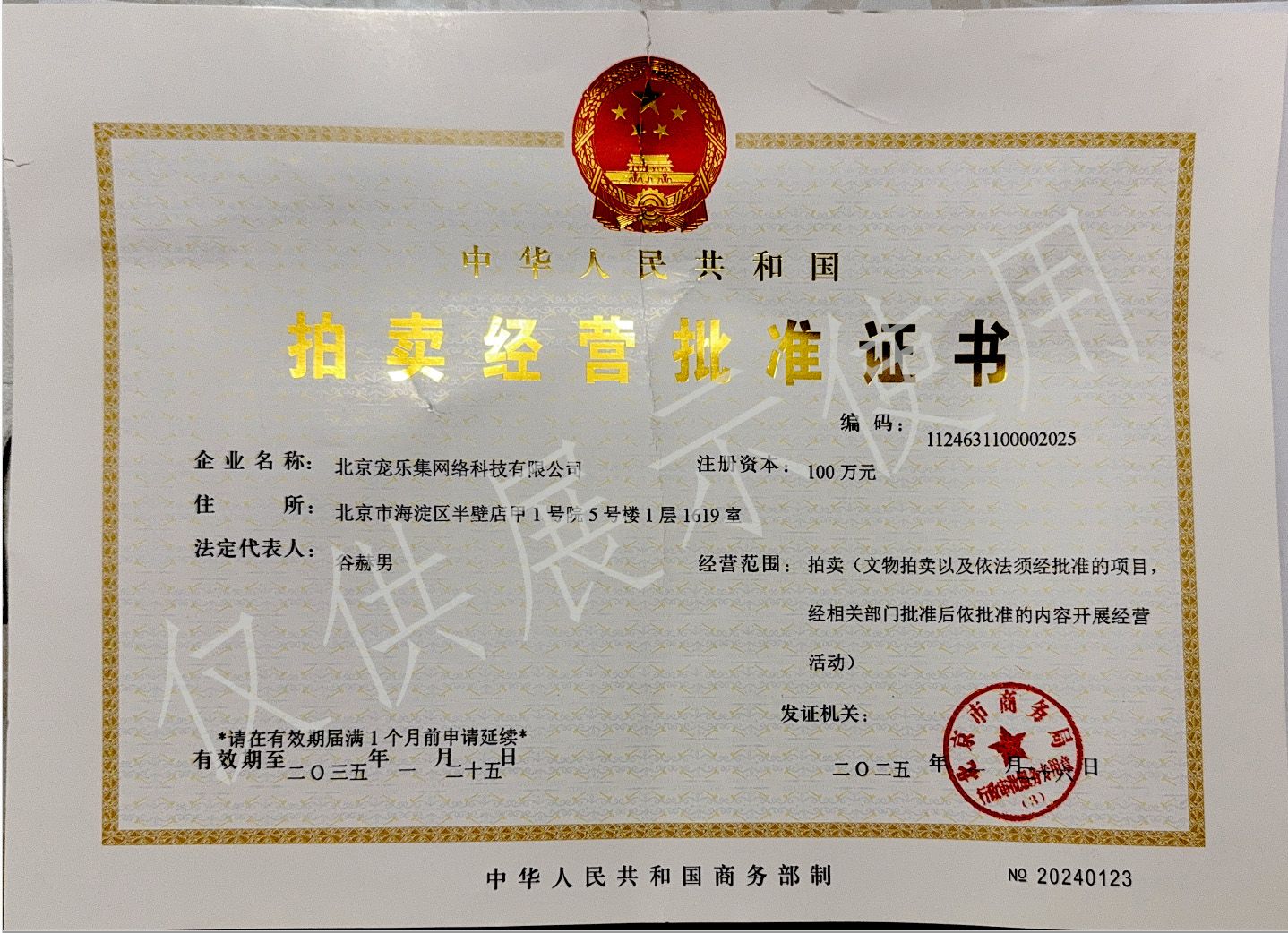 拍卖经营批准证书